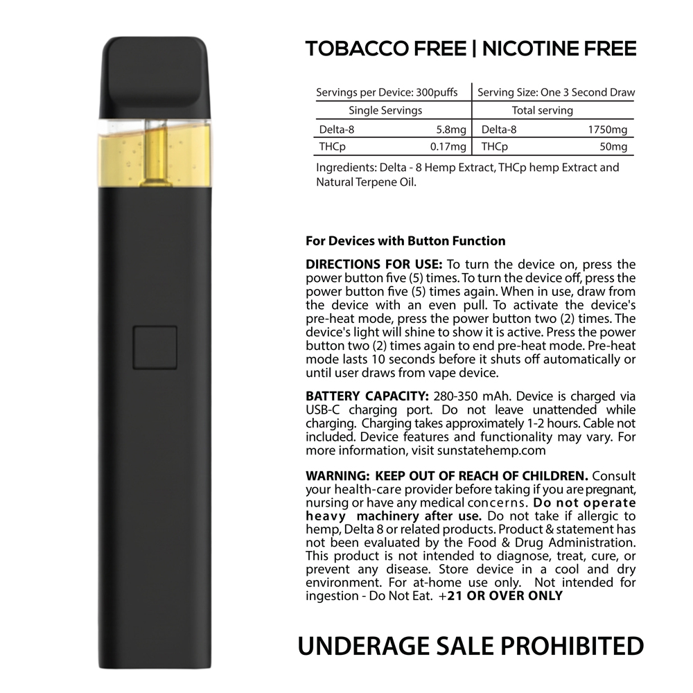 WARNING: Keep out of reach of children. Consult your healthcare provider before taking if you are pregnant, nursing or have any medical concerns. Do not operate heavy machinery after use. Do not take if allergic to hemp, Delta-8 or related products. Product & statement has not been evaluated by the Food & Drug Administration. This product is not intended to diagnose, treat, cure, or prevent any disease. Store device in a cool and dry environment. For at-home use only. Underage Sale Prohibited. Not Intended for Ingestion – Do Not Eat.